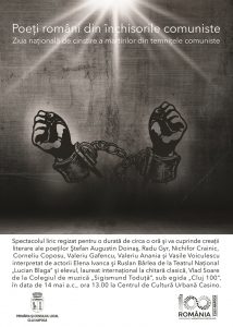 Martirii din temnițele comuniste vor fi omagiați la Cluj printr-un spectacol inedit. Este vorba de spectacolul liric intitulat „Poeţi români din închisorile comuniste”, sub egida „Cluj 100”, programat luni, 14 mai 2018, ora 13.00, în clădirea Casino din Parcul Central.