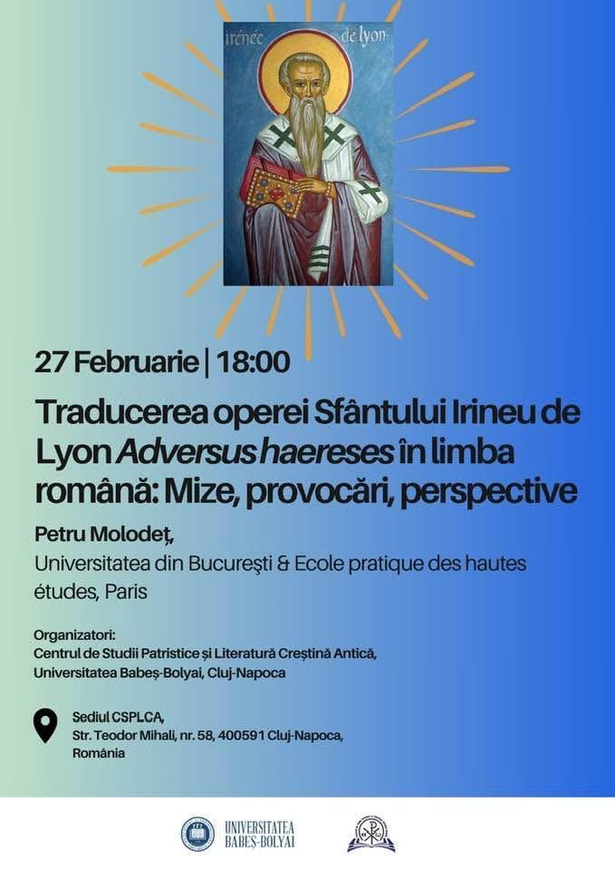 Un eveniment cultural important este programat în această seară. Centrul de Studii Patristice și Literatură Comparată Antică din cadrul Universității Babeș-Bolyai găzduiește un eveniment remarcabil. Unul dintre cei mai buni specialiști în domeniul literaturii patristice, Petru Molodeț, va împărtăși cu publicul clujean secretele traducerii din Sfântul Irineu de Lyon. Petru Molodeț activează la Ecole Pratique des Hautes Etudes din Paris și la Universitatea din București. Evenimentul are loc azi, de la ora 18.00, la sediul Centrului, de pe strada Teodor Mihali, numărul 58, potrivit ClujToday.ro.